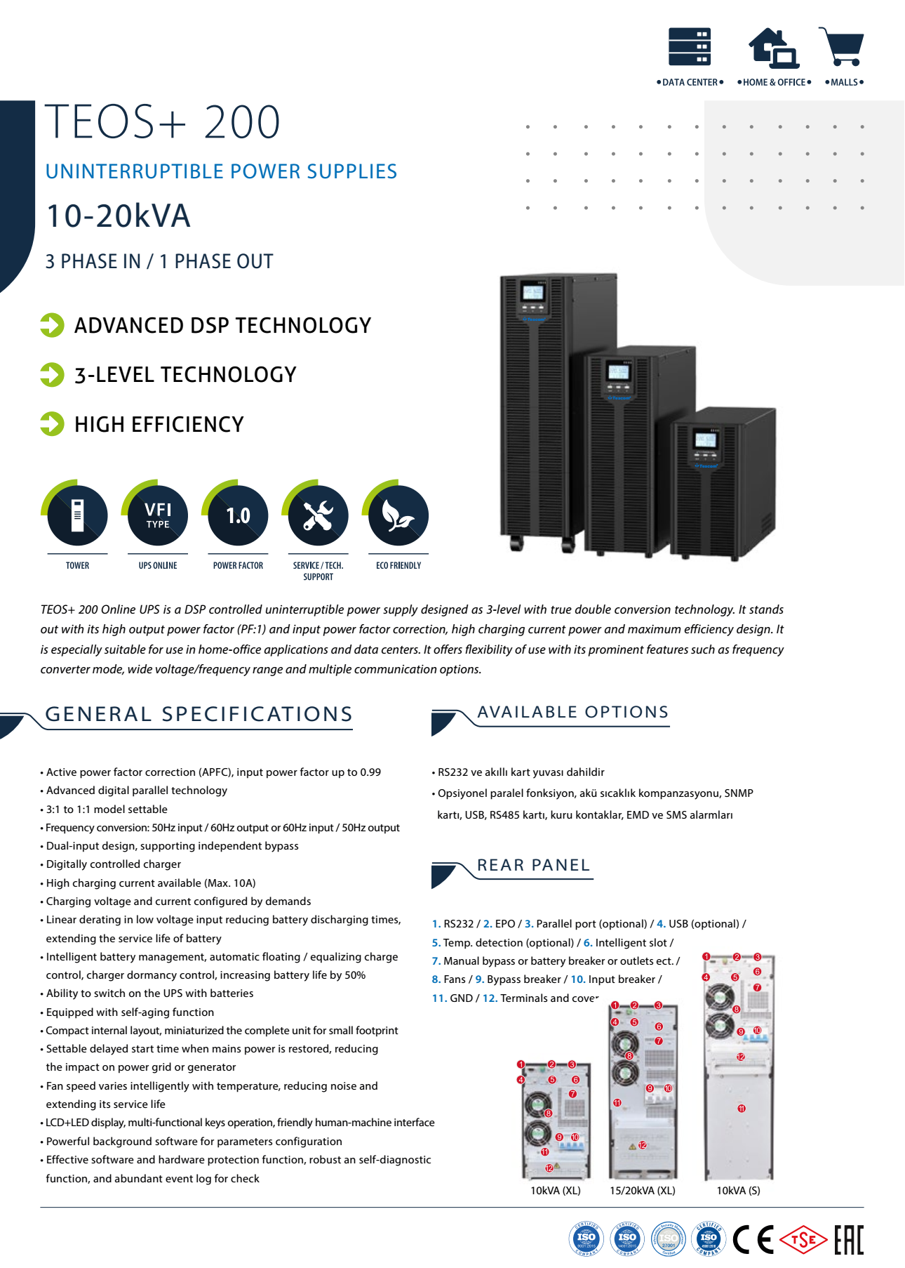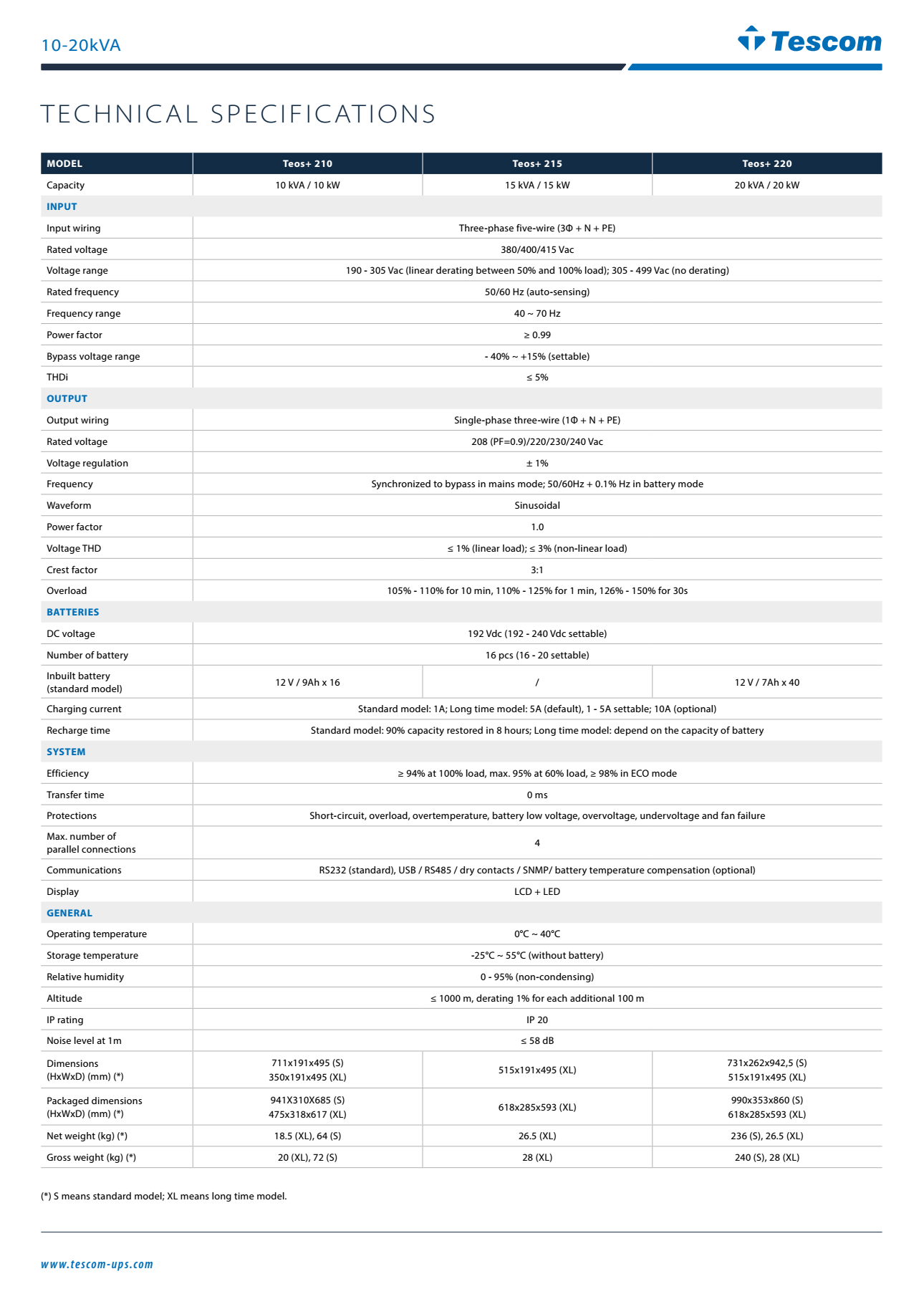 Mô tả sản phẩm:Bộ lưu điện Tescom Teos 20kVA 3/1 là dòng sản phẩm phù hợp đa dạng chủng loại thiết bị tải tại các nhà máy xí nghiệp trong khu công nghiệp, dây chuyền sản xuất, server, data center, phòng mổ của bệnh, phòng khám, máy xét nghiệm…