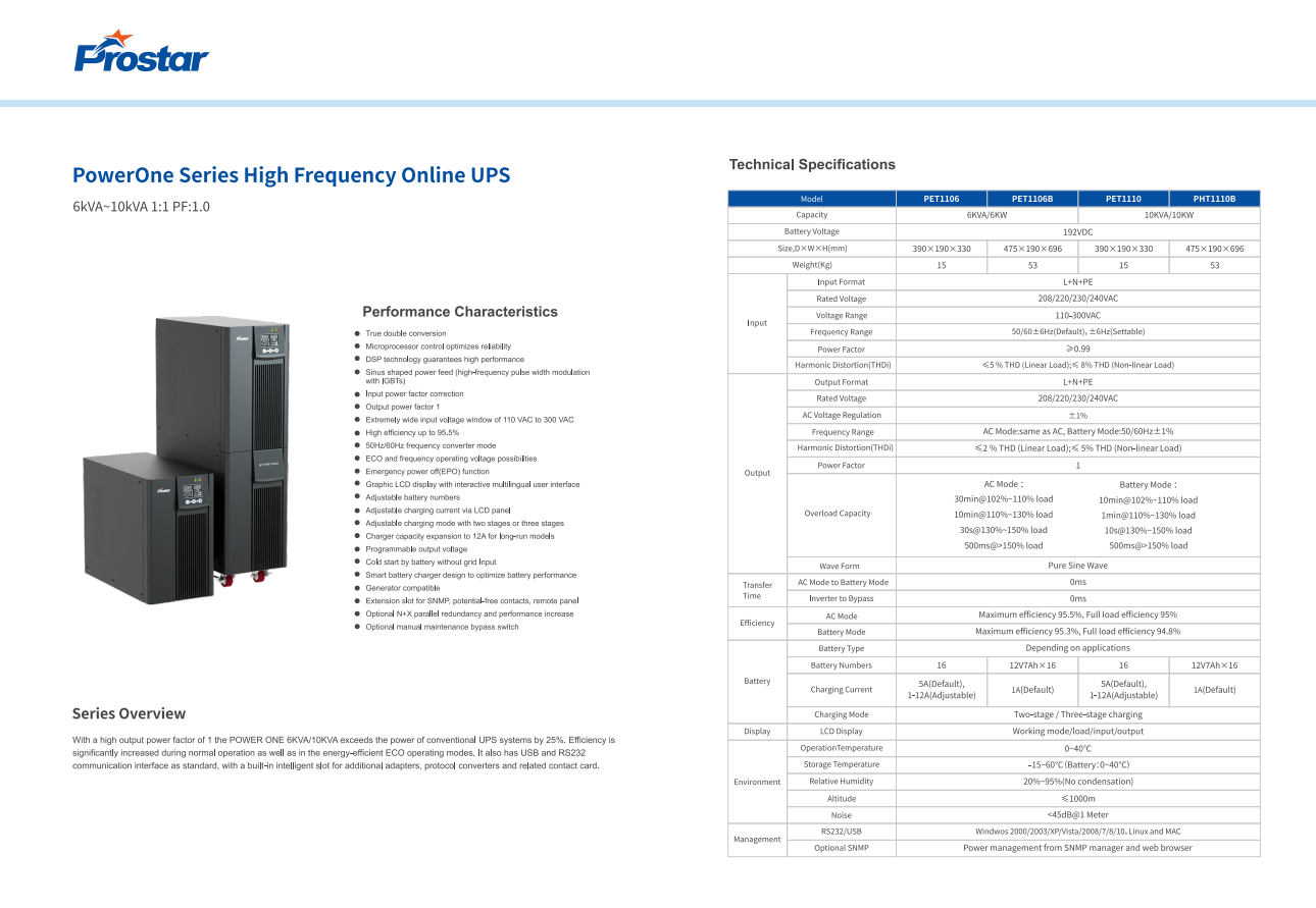 Bộ lưu điện UPS chuyển đổi kép trực tuyến Prostar PET1106B 6kVA tốt nhất dành cho máy tính để bàn cung cấp khả năng bảo vệ mạnh mẽ hơn nhiều đối với dòng khởi động và cải thiện khả năng thích ứng với điều kiện nguồn điện lưới.