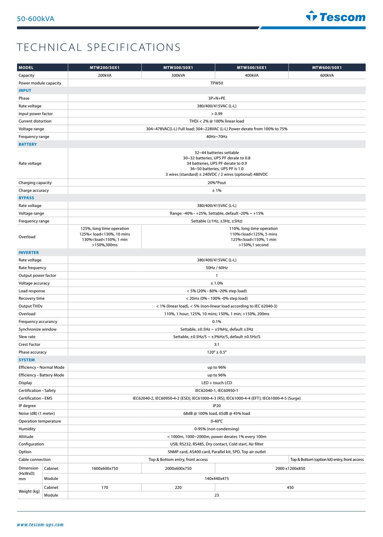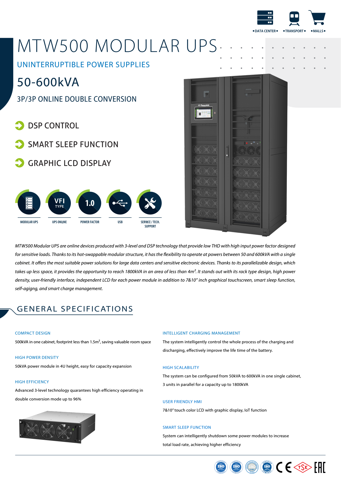 Bộ lưu điện UPS mô-đun MTW500 là thiết bị trực tuyến được sản xuất với công nghệ DSP 3 cấp nguồn, được thiết kế cho các tải nhạy cảm. Nhờ cấu trúc mô-đun có thể hoán đổi nóng, sản phẩm có khả năng công suất từ 50 đến 600kVA chỉ với một tủ duy nhất. Sản phẩm cung cấp giải pháp nguồn điện phù hợp nhất cho các trung tâm dữ liệu lớn. Nhờ thiết kế song song, chiếm ít không gian hơn, sản phẩm có thể đạt công suất 1800kVA trong diện tích dưới 4m². Sản phẩm nổi bật với thiết kế dạng rack, màn hình LCD độc lập cho từng mô-đun nguồn, màn hình cảm ứng đồ họa 7 & 10 inch, chức năng ngủ thông minh, tự động tăng áp và quản lý sạc thông minh.