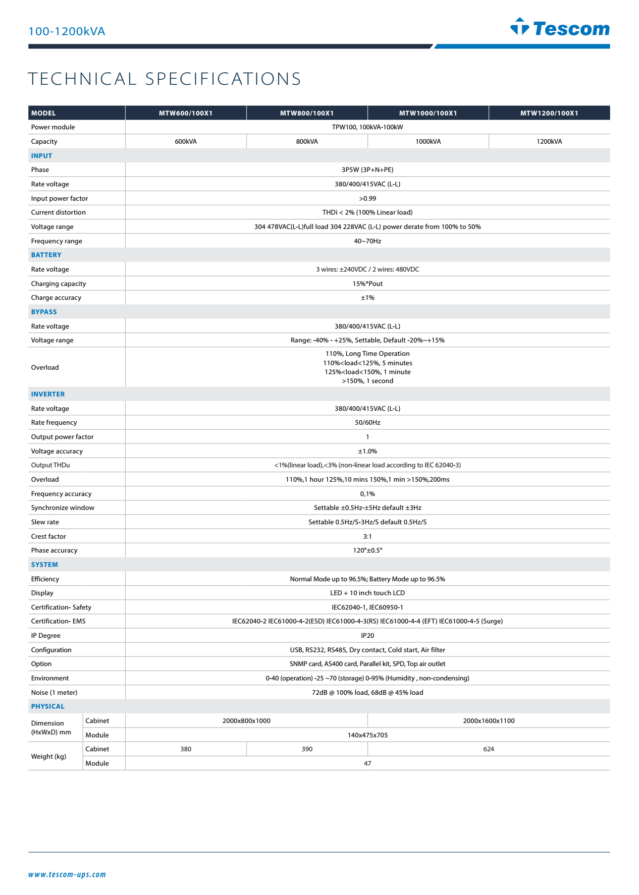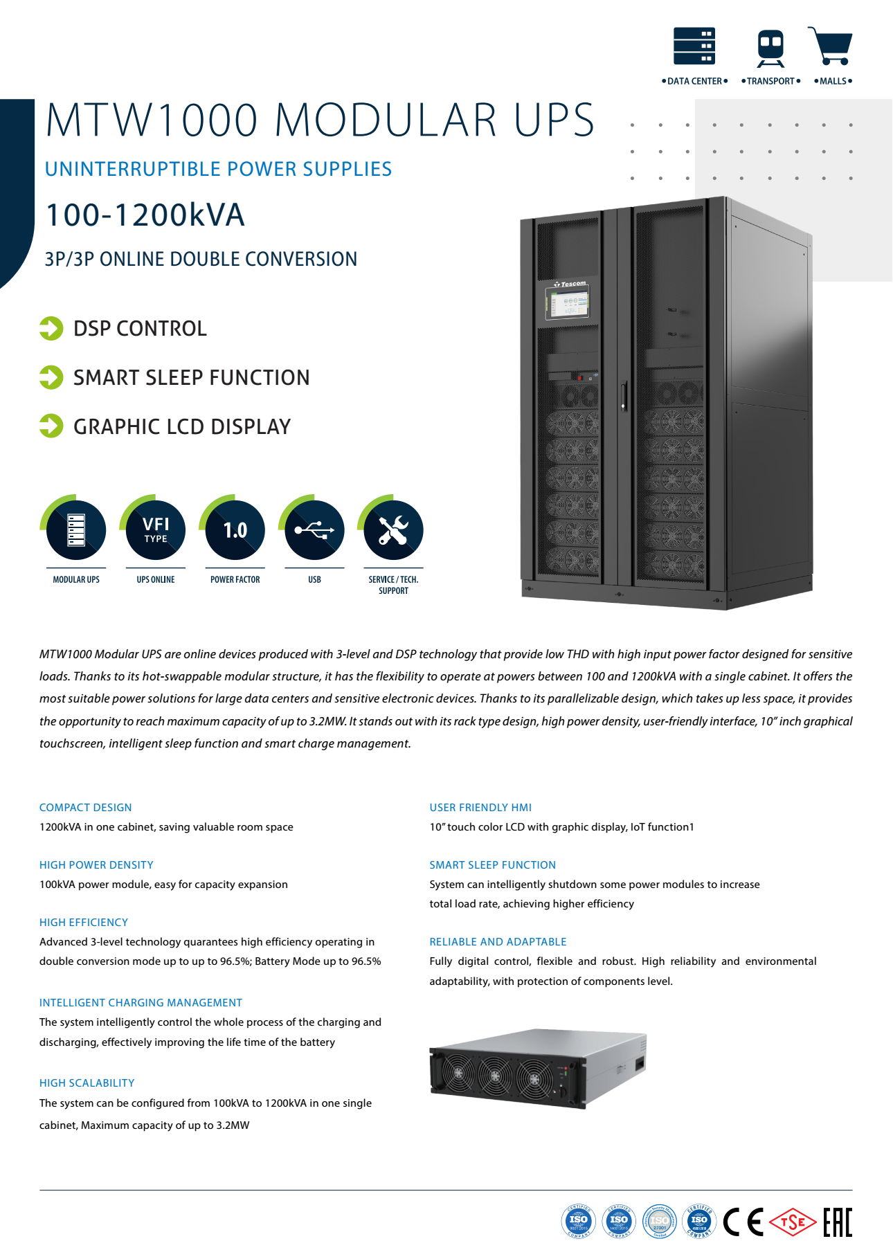 UPS mô-đun MTW1000 là thiết bị trực tuyến được sản xuất với công nghệ DSP 3 cấp độ. Nhờ cấu trúc mô-đun có thể hoán đổi nóng, sản phẩm có khả năng hoạt động linh hoạt ở công suất từ 100 đến 1200kVA chỉ với một tủ duy nhất. Sản phẩm cung cấp giải pháp nguồn điện các trung tâm dữ liệu lớn và các thiết bị điện tử nhạy cảm. Nhờ thiết kế song song, chiếm ít không gian hơn, sản phẩm có khả năng đạt công suất tối đa lên đến 3,2MW. Sản phẩm nổi bật với thiết kế dạng rack, mật độ công suất cao, màn hình cảm ứng đồ họa 10 inch.