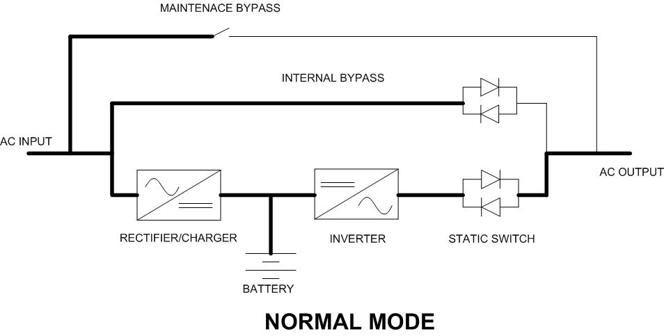 Trong chế độ NORMAL, năng lượng được nhận từ ngõ vào qua bộ chỉnh lưu cung cấp cho Inverter, “NORMAL mode” hiện thị trên màn hình có nghĩa là UPS đang hoạt động bình thường, nguồn ngõ vào nằm trong dải chấp nhận của UPS. Nguồn ngõ vào được chuyển thành nguồn DC thông qua bộ biến đổi IGBT và cung cấp nguồn DC cho inverter. Battery được nạp trực tiếp từ ngõ ra bộ chỉnh lưu thông qua bộ tăng áp và giảm áp phụ thuộc chủng loại và dung lượng bình acquy.